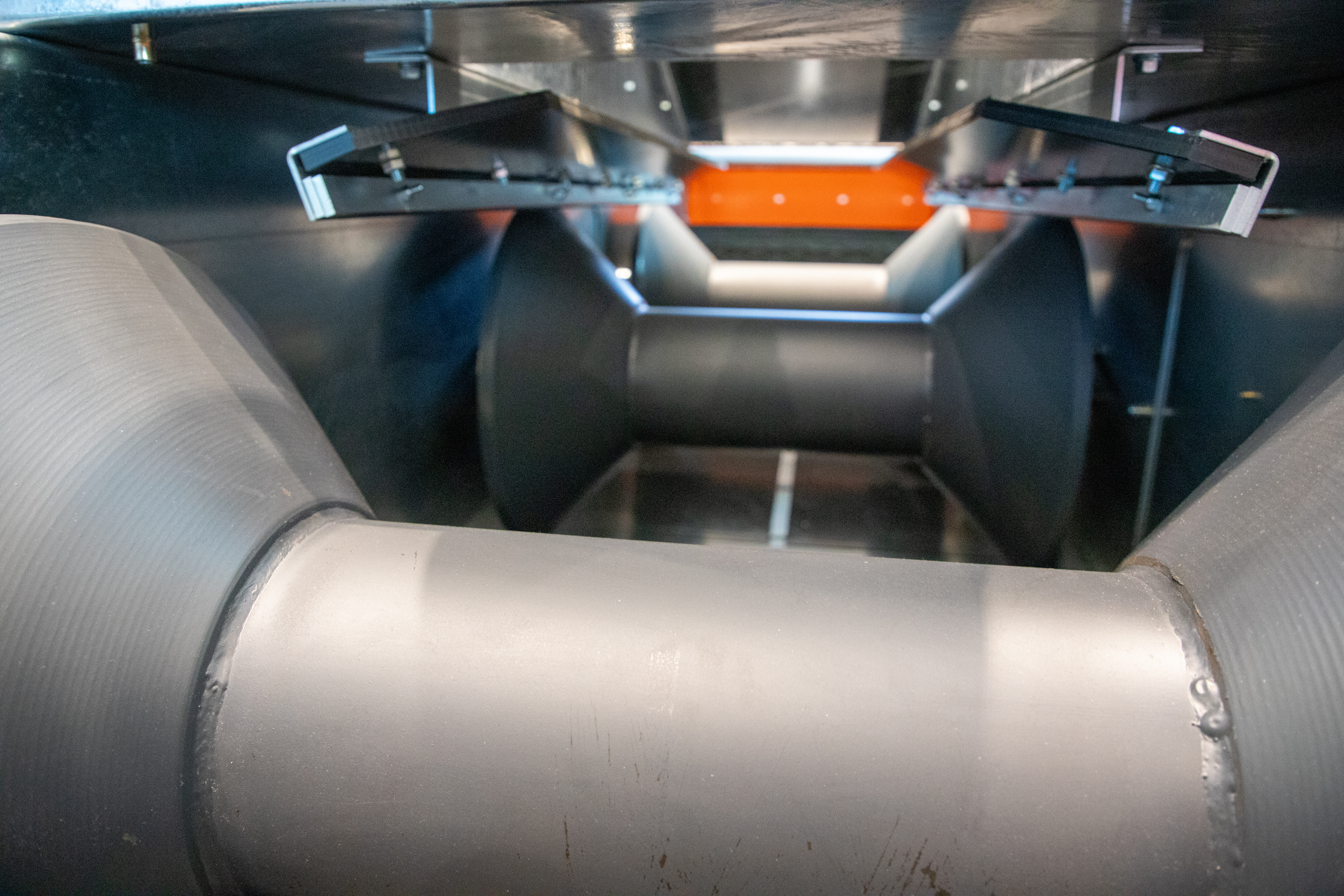 A ½" antistatic UHMW bottom liner and tongue-and-groove floating liner attachment promote smooth belt movement, reduced friction, and minimized static—key advantages for reliable grain conveying. The conveyor’s 5' spaced conical idlers, spherical roller bearings, and 1¼" stub shaft idler connection support consistent belt tracking and efficient grain transfer across the system.