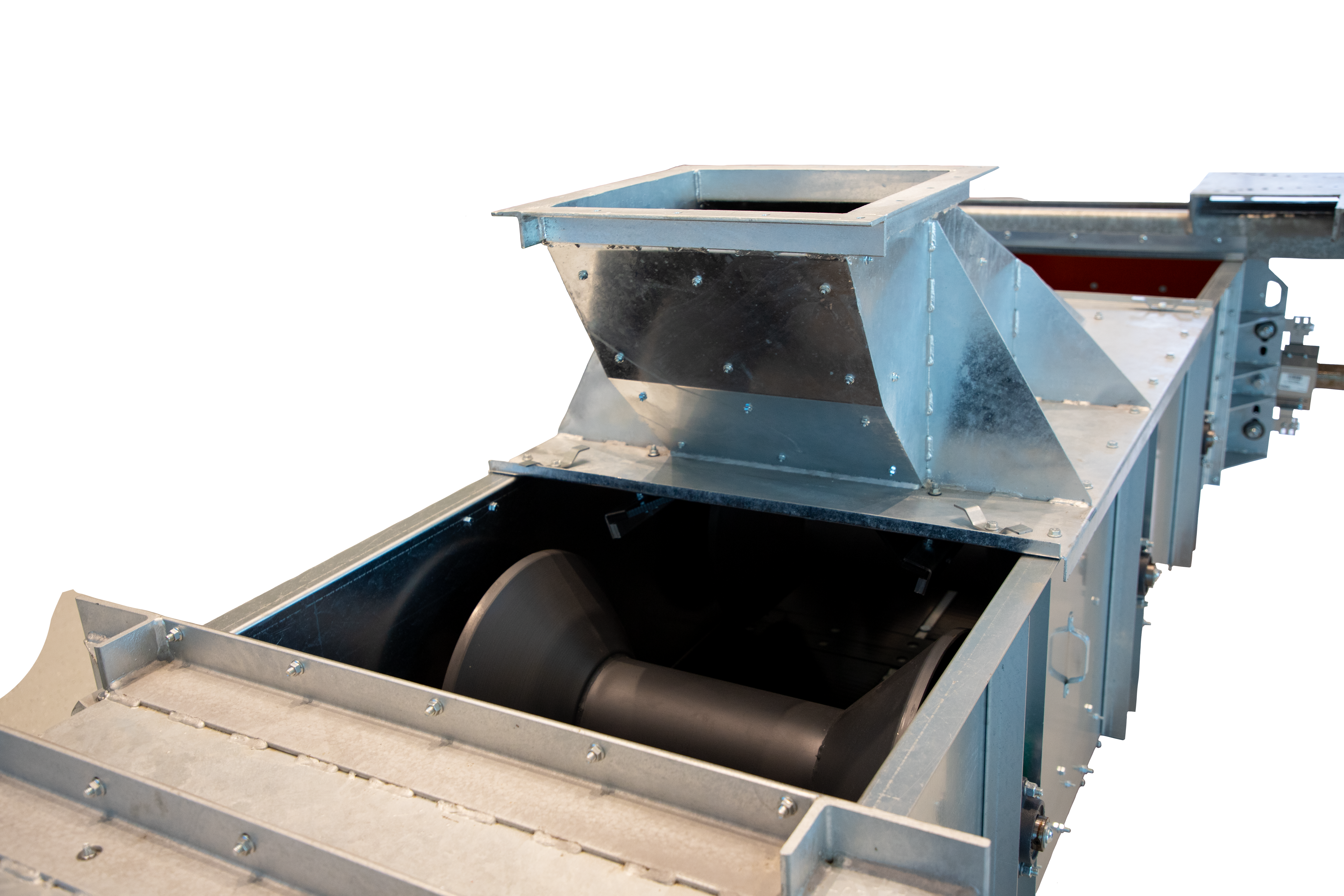 For maintenance efficiency, the enclosed conveyor includes a large service door, hinged inspection doors, bearing guards, and multiple liner options. The head section incorporates a slide-lagged head pulley with a lagging replacement door, plus an optional two-way discharge. The tail section features a self-cleaning herringbone reloading tail pulley and a plow to direct grain. A 42" telescoping take-up with a 2" acme threaded rod, 1½" leveling rods, and antistatic UHMW rails ensures accurate belt tensioning.